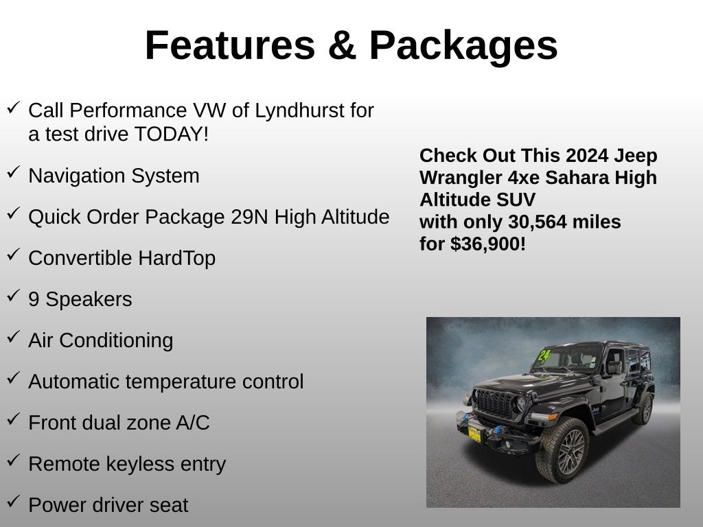 Designed to tackle any adventure, the 2024 Jeep Wrangler High Altitude 4xe is the ultimate expression of rugged versatility and refined sophistication. Experience the thrill of electrified off-road performance and the convenience of modern amenities, all wrapped in Jeep's iconic style.