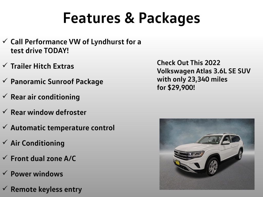 Whether you're looking for a family-friendly SUV, a versatile weekend warrior, or a capable all-around vehicle, the 2022 Volkswagen Atlas 3.6L V6 SE w/Technology is an exceptional choice that is sure to exceed your expectations. Experience the difference for yourself by scheduling a test drive at Performance VW of Lyndhurst today.